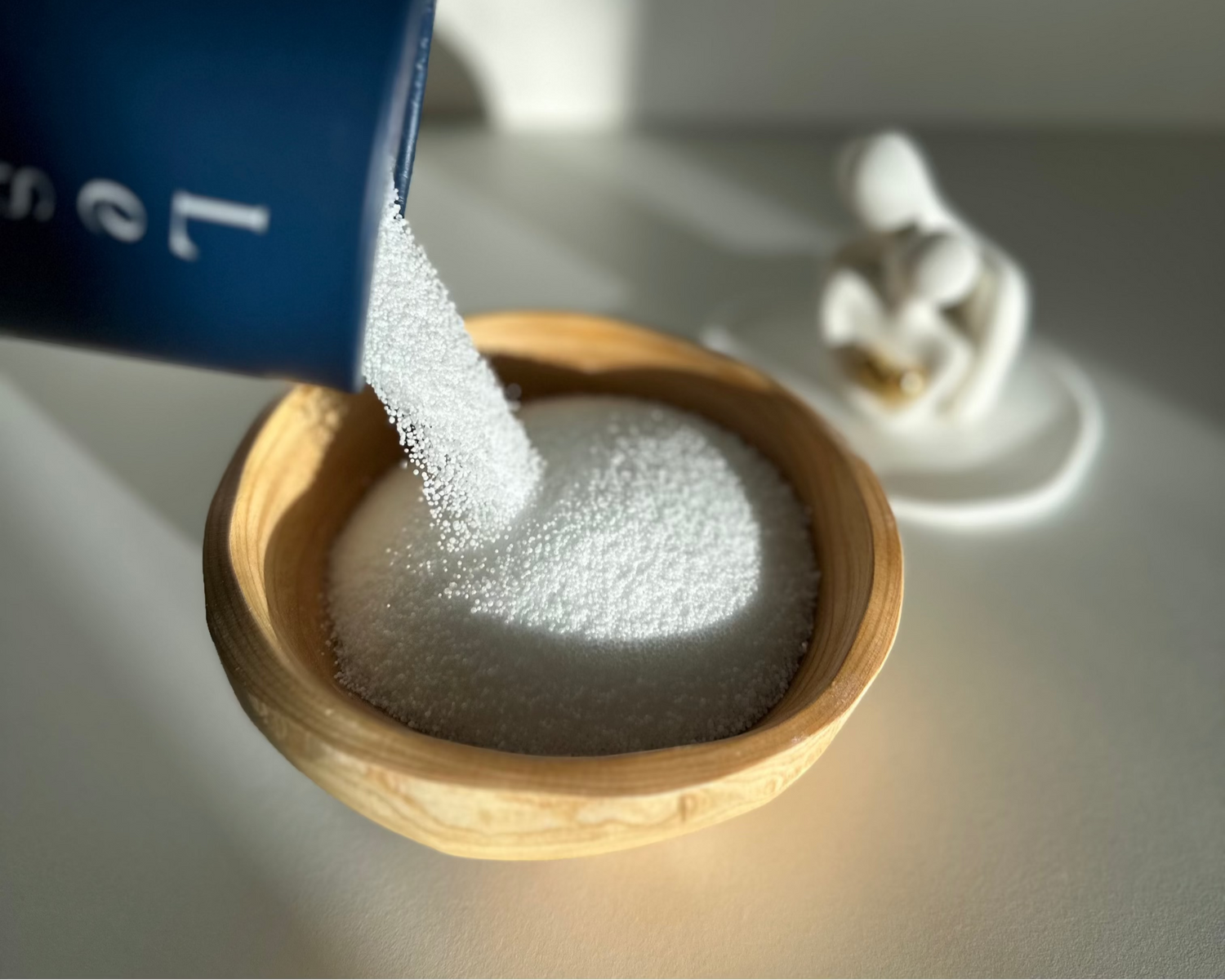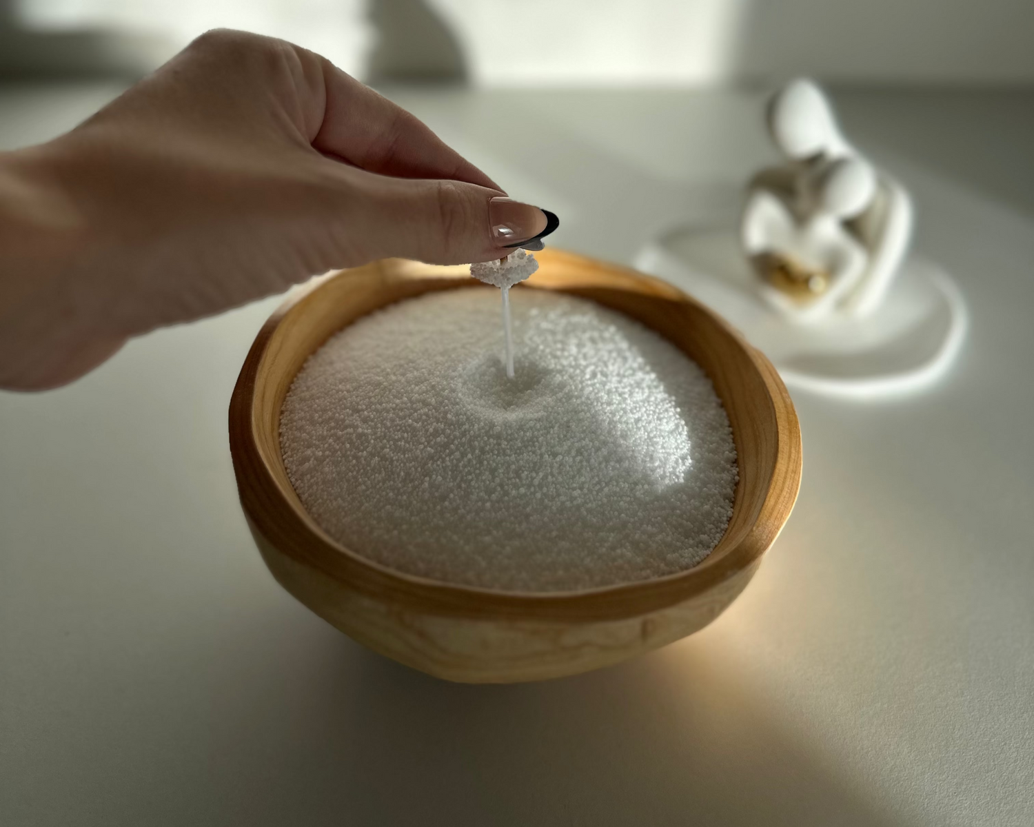- Pour the wax pearls into the container, then insert the wick securely in the centre, making sure it stands upright. The wick should extend no more than 0.5 cm above the wax pearls.